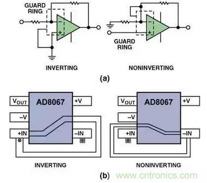 圖15(a)示出了用于運算放大器反相配置和同相配置中的保護環的原理圖。圖15(b)示出用于SOT-23-5封裝中兩種保護環的典型布線方法。
