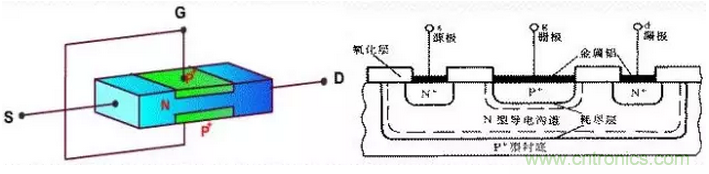 ※場效應(yīng)分類:場效應(yīng)管主要有結(jié)型場效應(yīng)管(JFET)和絕緣柵型場效應(yīng)管(IGFET)。絕緣柵型場效應(yīng)管的襯底(B)與源析(S)連在一起,它的三個極分別為柵極(G)、漏極(D)和源極(S)。晶體管分NPN和PNP管,它的三個極分別為基極(b)、集電極(c)、發(fā)射極(e)。場效應(yīng)管的G、D、S極與晶體管的b、c、e極有相似的功能。絕緣柵型效應(yīng)管和結(jié)型場效應(yīng)管的區(qū)別在于它們的導電機構(gòu)和電流控制原理根本不同,結(jié)型管是利用耗盡區(qū)的寬度變化來改變導電溝道的寬窄以便控制漏極電流,絕緣柵型場效應(yīng)管則是用半導體表面的電場效應(yīng)、電感應(yīng)電荷的多少去改變導電溝道來控制電流。它們性質(zhì)的差異使結(jié)型場效應(yīng)管往往運用在功放輸入級(前級),絕緣柵型場效應(yīng)管則用在功放末級(輸出級)。場效應(yīng)管的工作原理和三極管其本一樣,只是他們一個是壓控型元件,一個是電流控制元件,場效應(yīng)管只有一個PN結(jié),如圖所示1-1