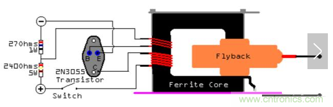 我們可以采用單管自激推高壓包的方法來產(chǎn)生高壓。我們使用一個2N3055三極管。