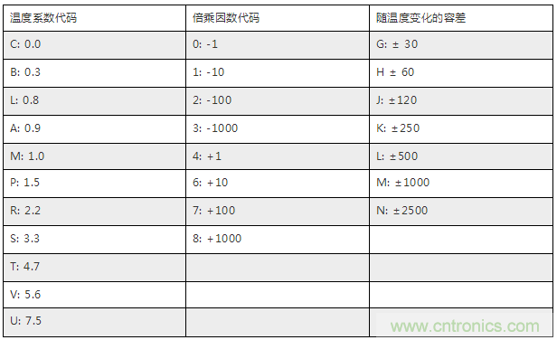 根據上面的表可以看出,一個“NP0”電容和“C0G”電容的漂移都為0,容差都為±30 ppm/K;一個“N1500” 電容和“P3K”電容的漂移都為−1500ppm/K,最大容差都為±250 ppm/°C。