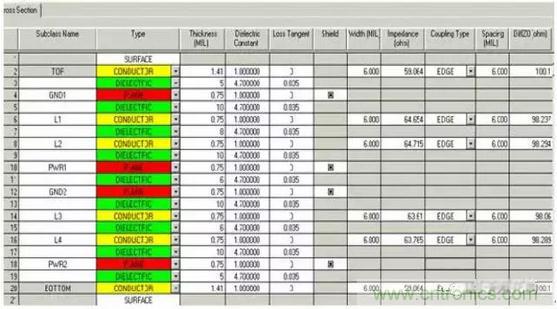 由上面的分析知道,PCB板的疊層設置和信號的耦合以及阻抗計算都有著密切的關系,所以在開始PCB設計之前必須進行疊層設計,然后進行信號的阻抗計算。在本設計中的疊層設計見下圖:
