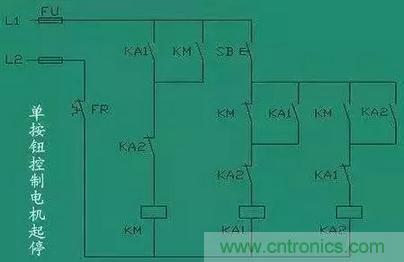 這個電路沒有太大的實用性,但是非常適合學習。2個中間繼電器和一個交流接觸器,我們看一下電路,2個繼電器互鎖,KA1的線圈串KM的輔助常閉點,KA2的線圈串KM的輔助常開點。所以按下SB按鈕開關KA1自鎖,同時KA1的常開點閉合KM自鎖,實現了啟動操作。然后再按下SB按鈕開關,KA2又會自鎖,KA2的常閉點會斷開,而KA2的常閉點是串的KM的線圈,所以同時KM線圈失電,實現停止操作。