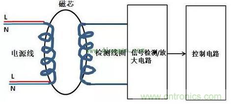 如圖1所示,漏電保護器正常工作時,因未漏電,故只有零線和火線有電流流動,即i1不存在,i0=i2,通過圖2分析得知,由于零線和火線電流大小相等,方向相反磁場相互抵消,故磁芯不生產(chǎn)耦合磁場,圖4的檢測線圈不生產(chǎn)感應(yīng)電勢,控制電路不動作;當(dāng)有漏電發(fā)送時,i1電流存在,火線電流i0=i1+i2,零線電流為i2,火線電流大于零線電流,不對稱,故磁芯有耦合磁場傳遞到檢測線圈那,檢測線圈產(chǎn)生感應(yīng)電勢,導(dǎo)致控制電路動作切斷電源。