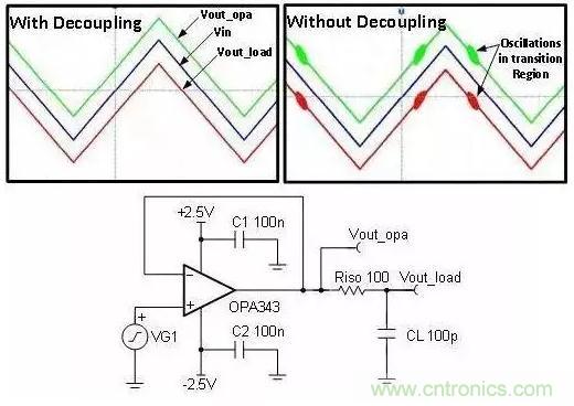 要回答這個(gè)問(wèn)題,需要考證在不使用去耦器件時(shí)會(huì)出現(xiàn)什么問(wèn)題。 圖 1 為帶去耦電容器和不帶去耦電容器(C1 和C2)情況下用于驅(qū)動(dòng) R-C 負(fù)載的緩沖電路。我們注意到,在不使用去耦電容器的情況下,電路的輸出信號(hào)包含高頻 (3.8MHz) 振蕩。對(duì)于沒(méi)有去耦電容器的放大器而言,通常會(huì)出現(xiàn)穩(wěn)定性低、瞬態(tài)響應(yīng)差、啟動(dòng)出現(xiàn)故障以及其它多種異常問(wèn)題。