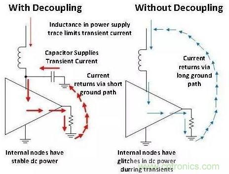 圖 2 闡述了為什么去耦非常重要。需要注意的是,電源線跡的電感將限制暫態(tài)電流。 去耦電容與器件非常接近,因此電流路徑的電感很小。在暫態(tài)過(guò)程中,該電容器可在非常短的時(shí)間內(nèi)向器件提供超大量的電流。 未采用去耦電容的器件無(wú)法提供暫態(tài)電流,因此放大器的內(nèi)部節(jié)點(diǎn)會(huì)下垂(通常稱為干擾)。無(wú)去耦電容的器件其內(nèi)部電源干擾會(huì)導(dǎo)致器件工作不連續(xù),原因是內(nèi)部節(jié)點(diǎn)未獲得正確的偏置。