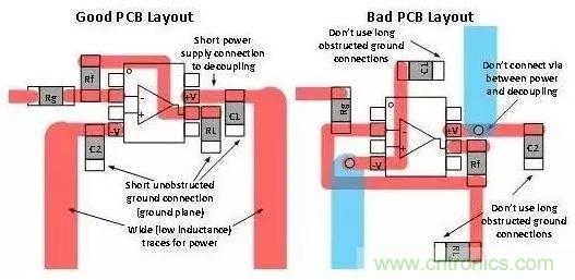 除了使用去耦電容器外,您還要在去耦電容器、電源和接地端之間采取較短的低阻抗連接。圖3將良好的去耦合板面布局與糟糕的布局進(jìn)行了對(duì)比。您應(yīng)始終嘗試著讓去耦合連接保持較短的距離,同時(shí)避免在去耦合路徑中出現(xiàn)通孔,原因是通孔會(huì)增加電感。大部分產(chǎn)品說(shuō)明書都會(huì)給出去耦合電容器的推薦值。如果沒(méi)有給出,則可以使用0.1uF。