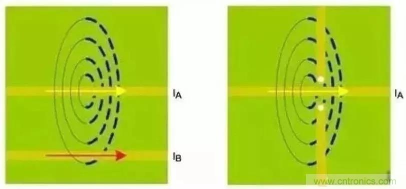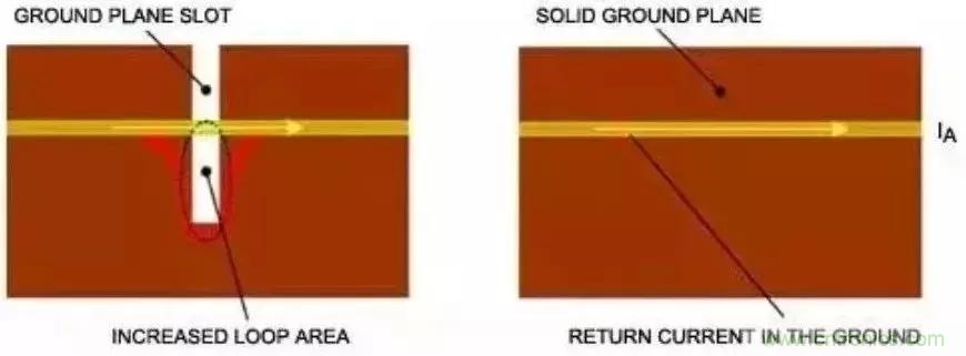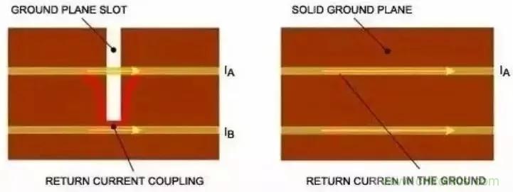直流電流總是傾向于沿著低阻通路流通。同理,高頻電流也是優(yōu)先流過(guò)最低電阻的通路。所以,對(duì)于地層上方的標(biāo)準(zhǔn)PCB微帶線,返回電流試圖流入引線正下方的接地區(qū)域。按照上述引線耦合部分所述,割斷的接地區(qū)域會(huì)引入各種噪聲,進(jìn)而通過(guò)磁場(chǎng)耦合或匯聚電流而增大串?dāng)_(圖7)。