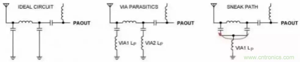如果敏感電路共用過(guò)孔,例如π型網(wǎng)絡(luò)的兩個(gè)臂,則會(huì)產(chǎn)生其它問(wèn)題。例如,放置一個(gè)等效于集總電感的理想過(guò)孔,等效原理圖則與原電路設(shè)計(jì)有很大區(qū)別(圖6)。與共用電流通路的串?dāng)_一樣3,導(dǎo)致互感增大,加大串?dāng)_和饋通。