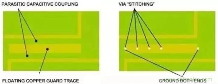 填充地也稱為保護(hù)線,通常將其用于電路中很難鋪設(shè)連續(xù)接地區(qū)域或需要屏蔽敏感電路的設(shè)計(jì)(圖8)。通過(guò)在引線兩端,或者是沿線放置接地過(guò)孔(即過(guò)孔陣列),增大屏蔽效應(yīng)。請(qǐng)不要將保護(hù)線與設(shè)計(jì)用來(lái)提供返回電流通路的引線相混合,這樣的布局會(huì)引入串?dāng)_。