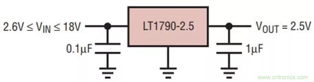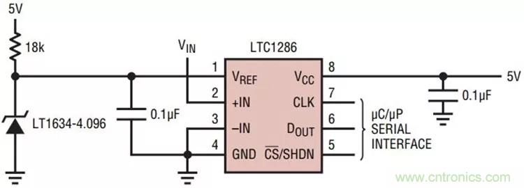 ADI提供的串聯產品包括LT1460、LT1790、LT1461、LT1021、LT1236、LT1027、LTC6652、LT6660等等。LT1021和LT1019等產品可以用作分流或串聯基準電壓源。串聯基準電壓源電路如圖4所示。