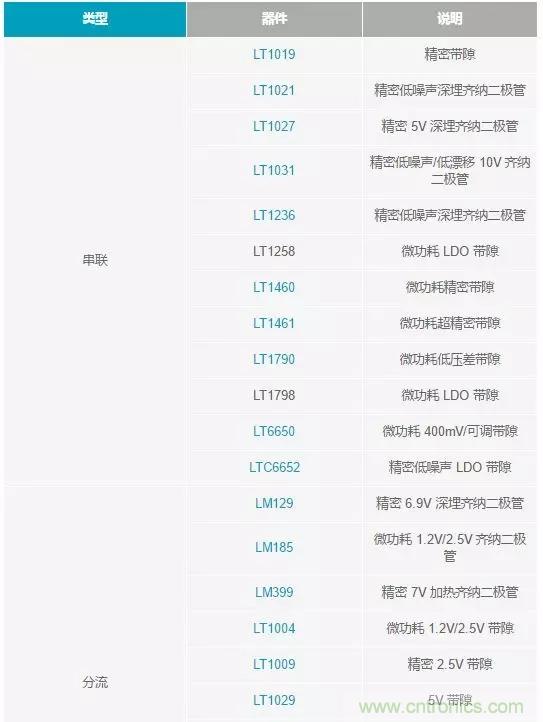 基準電壓源主要有兩類:分流和串聯。ADI的串聯和分流基準電壓源參見表2。