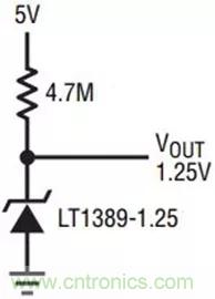 分流基準電壓源的有點包括:設計簡單,封裝小,在寬電流和負載條件下具有良好的穩定性。此外,它很容易設計為負基準電壓源,并且可以配合非常高的電源電壓使用(因為外部電阻會分攤大部分電位),或配合非常低的電源電壓使用(因為輸出可以僅低于電源電壓幾毫伏)。ADI提供的分流產品包括 LT1004、LT1009、LT1389、LT1634、LM399 和 LTZ1000。典型分流電路如圖3所示。