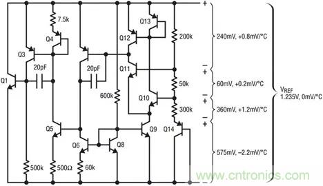 圖6所示為LM10的核心電路,同正常帶隙基準電壓源相似,其中結合了與溫度成正比和成反比的元件,以獲得恒定的200mV基準電壓。分數帶隙基準電壓源通常使用?VBE產生一個與溫度成正比的電流,使用VBE產生一個與溫度成反比的電流。二者以適當的比例在一個電阻元件中合并,以產生不隨溫度變化的電壓。電阻大小可以更改,從而改變基準電壓而不影響溫度特性。這與傳統帶隙電路的不同之處在于,分數帶隙電路合并電流,而統電路傾向于合并電壓,通常是基極-發射極電壓和具有相反 TC 的 I•R。