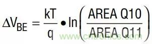 基本帶隙基準電壓源背后的數學原理很有意思,因為它將已知溫度系數與獨特的電阻率相結合,產生理論上溫度漂移為零的基準電壓。圖5顯示了兩個晶體管,經調整后,Q10的發射極面積為Q11的10倍,而Q12和Q13的集電極電流保持相等。這就在兩個晶體管的基極之間產生一個已知電壓: