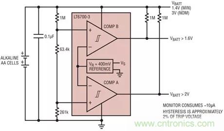 LT6700(圖7)和LT6703是集成度更高的解決方案,其將400mV基準電壓源與比較器相結合,可用作電壓監控器或窗口比較器。400mV基準電壓源可以監控小輸入信號,從而降低監控電路的復雜性;它還能監控采用非常低電源電壓工作的電路元件。如果閾值較大,可以添加一個簡單的電阻分壓器(圖8)。這些產品均采用小尺寸封裝(SOT23),功耗很低(低于 10μA),支持寬電源范圍 (1.4V 至 18V)。此外,LT6700 提供 2mm x 3mm DFN 封裝,LT6703 提供 2mm x 2mm DFN 封裝。