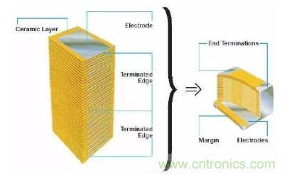 片式多層陶瓷電容器(MLCC),由內(nèi)電極、陶瓷層和端電極三部分組成,其介質(zhì)材料與內(nèi)電極以錯(cuò)位的方式堆疊,然后經(jīng)過(guò)高溫?zé)Y(jié)燒制成形,再在芯片的兩端封上金屬層,得到了一個(gè)類(lèi)似于獨(dú)石的結(jié)構(gòu)體,故MLCC也常被稱(chēng)為“獨(dú)石電容器”。