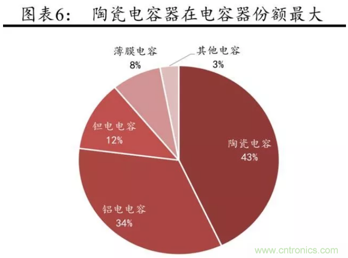 據(jù)中國(guó)產(chǎn)業(yè)信息網(wǎng) 2017年 5 月報(bào)道,陶瓷電容器在包括鋁電解電容 器、鉭電解電容器及薄膜電容器在內(nèi)的四類(lèi)主要電容器中市場(chǎng)份額最高,達(dá)到約43%,是當(dāng)前生產(chǎn)規(guī)模最大、發(fā)展最快的片式元器件之一。