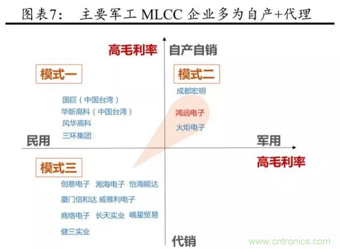 自產(chǎn)自銷(xiāo)模式中,在軍用領(lǐng)域,MLCC 因主要采用定制供應(yīng)商目錄的管理模式,且需要獲得一系列嚴(yán)格的資質(zhì)審查,且軍用高可靠 MLCC 對(duì)產(chǎn)品性能、可靠性及供貨穩(wěn)定性有著更高或更特殊的要求等,具有較高的市場(chǎng)壁壘,毛利率水平一般可以達(dá)到 70%~80%,代表廠商有鴻遠(yuǎn)電子、火炬電子等,顯著高于民品。
