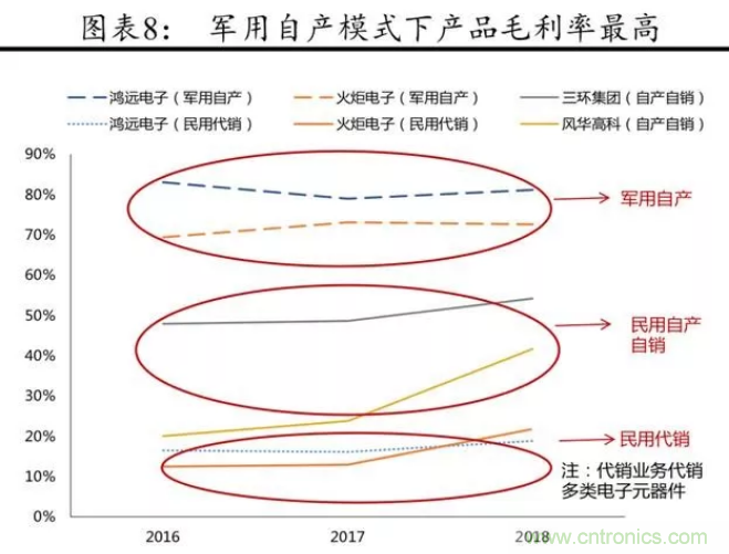 但自產(chǎn)自銷(xiāo)模式在民品領(lǐng)域的毛利率水平分化較大,在 20%~55%的較大毛利率分布 區(qū)間內(nèi)浮動(dòng)。擁有相對(duì)核心陶瓷技術(shù)的三環(huán)集團(tuán)的毛利率水平明顯高于風(fēng)華高科,兩者均受益于 2018 年的 MLCC 漲價(jià)潮,但風(fēng)華高科的毛利率水平的波動(dòng)顯著高于三環(huán)集團(tuán)。