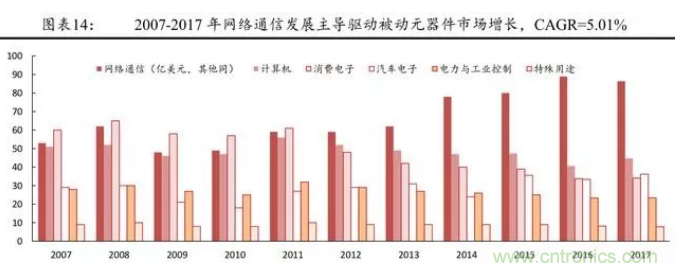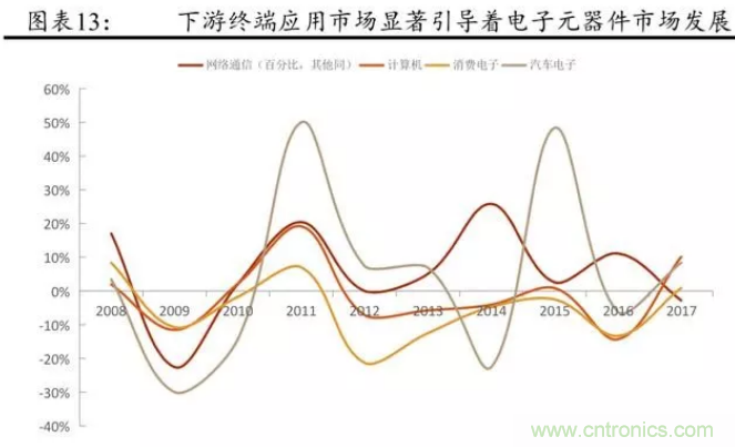 從被動(dòng)元件的發(fā)展歷程來(lái)看,近些年來(lái),產(chǎn)業(yè)鏈下游的需求擴(kuò)大主導(dǎo)著被動(dòng)元件市場(chǎng)的擴(kuò)張。金融危機(jī)以來(lái),全球電子元件市場(chǎng)規(guī)模的增長(zhǎng)主要來(lái)自于網(wǎng)絡(luò)通信與汽車(chē)電子,尤其是智能手機(jī)。