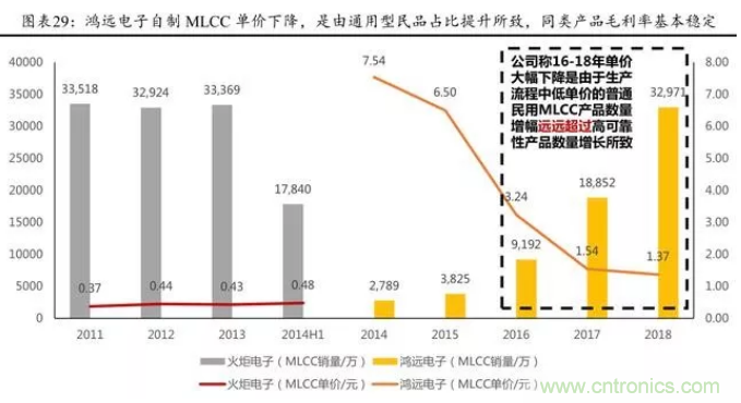 從各企業(yè)生產(chǎn) MLCC 價(jià)值量看,2014H1 火炬電子生產(chǎn)陶瓷電容 器平均單價(jià)為 0.46 元, 而鴻遠(yuǎn)電子 2014 年MLCC平均單價(jià)為 7.54 元,近幾年呈現(xiàn)下降趨勢(shì), 我們判斷,整體主要是因?yàn)樽灾撇糠滞ㄓ眯兔衿返臄?shù)量占比略有提升。