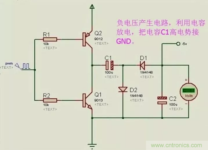 當PWM為低電平時,Q2關閉,Q1打開,C1開始放電,放電回路是C1-C2-D1,這實際上也是對C2進行充電的過程。C2充好電后,下正上負,如果VCC的電勢為5點幾伏,就可以輸出-5V的電壓了。