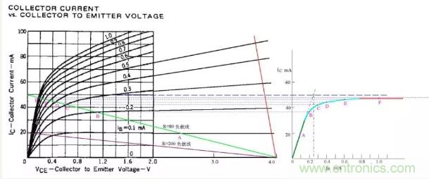 圖中假定電源電壓為4V,綠色的斜線是負(fù)載電阻為80歐姆的負(fù)載線,V/R=50MA,圖中標(biāo)出了Ib分別等于0.1、0.2、0.3、0.4、0.6、1.0mA的工作點(diǎn)A、B、C、D、E、F。據(jù)此在右側(cè)作出了Ic與Ib的關(guān)系曲線。根據(jù)這個(gè)曲線,就比較清楚地看出“飽和”的含義了。曲線的綠色段是線性放大區(qū),Ic隨Ib的增大幾乎成線性地快速上升,可以看出β值約為200。蘭色段開(kāi)始變彎曲,斜率逐漸變小。紅色段就幾乎變成水平了,這就是“飽和”。實(shí)際上,飽和是一個(gè)漸變的過(guò)程,蘭色段也可以認(rèn)為是初始進(jìn)入飽和的區(qū)段。在實(shí)際工作中,常用Ib*β=V/R作為判斷臨界飽和的條件。在圖中就是假想綠色段繼續(xù)向上延伸,與Ic=50MA的水平線相交,交點(diǎn)對(duì)應(yīng)的Ib值就是臨界飽和的Ib值。圖中可見(jiàn)該值約為0.25mA。