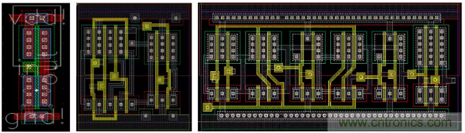對于標(biāo)準(zhǔn)單元的版圖,根據(jù)工藝要求,標(biāo)準(zhǔn)邏輯單元的高度是固定的,寬度為最小單元寬度的公約數(shù)倍數(shù),例如在圖3中,左圖為反向器(inverter,INV)的版圖,中圖為選擇器(multiplexer,MUX)的版圖,右圖為D型寄存器的(D-Flip Flop, DFF)的版圖。如上所述,從版圖設(shè)計中,可以導(dǎo)出并建立GDSII和LEF文件。GDSII文件經(jīng)過設(shè)計簽核(design sign-off)過程由代工廠使用于芯片制造,LEF文件用于全芯片的P&R物理設(shè)計。