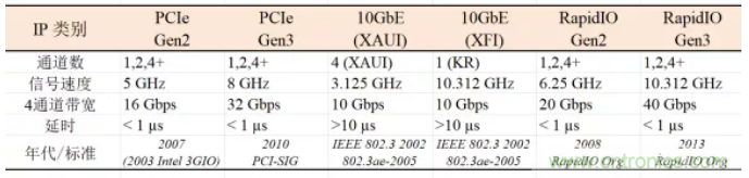 物聯(lián)網(wǎng)和5G聯(lián)網(wǎng)通信中除了信號收發(fā)單元(transceiver, TRX 以及TX/RX)設(shè)計芯片之外,離不開專用的系統(tǒng)芯片SoC,其中高性能與高速核心IP往往決定了SoC的性能和速度。常見的高性能與高速核心IP有: PCIe, 10 Gigabit Ethernet (10 GbE), RapidIO, SerDes, USB等。表1列出了幾種物聯(lián)網(wǎng)和5G時代常用的高性能與高速IP的信號速度和數(shù)據(jù)率。