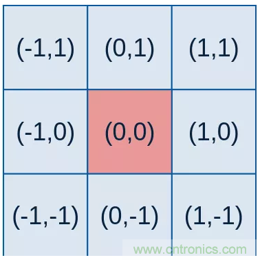 其中(x,y)(x,y)為點(diǎn)坐標(biāo),在圖像處理中可認(rèn)為是整數(shù);σσ是標(biāo)準(zhǔn)差。要想得到一個(gè)高斯濾波器的模板,可以對(duì)高斯函數(shù)進(jìn)行離散化,得到的高斯函數(shù)值作為模板的系數(shù)。例如:要產(chǎn)生一個(gè)3×33×3的高斯濾波器模板,以模板的中心位置為坐標(biāo)原點(diǎn)進(jìn)行取樣。模板在各個(gè)位置的坐標(biāo),如下所示(x軸水平向右,y軸豎直向下)