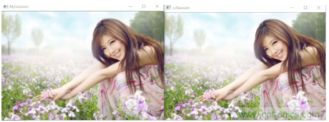 下圖是自己實(shí)現(xiàn)的高斯濾波器和OpenCV中的GaussianBlur的結(jié)果對(duì)比
