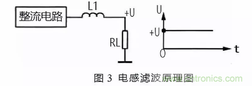 圖 3 所示是電感濾波原理圖。由于電感 L1 對直流電相當于通路,這樣整流電路輸出的直流電壓直接加到負載 RL 上。