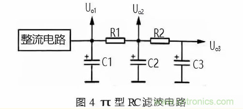 圖 4 所示是 π 型 RC 濾波電路。電路中的 C1、C2 和 C3 是 3 只濾波電容,R1 和 R2 是濾波電阻,C1、R1 和C2 構(gòu)成第一節(jié) π 型的 RC 濾波電路,C2、R2 和 C3 構(gòu)成 第二節(jié) π 型 RC 濾波電路。