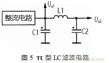 圖 5 所示是 π 型 LC 濾波電路。π 型 LC 濾波電路與 π 型 RC 濾波電路基本相同。這一電路只是將濾波電阻換成濾波電感,因為濾波電阻對直流電和交流電存在相同的電阻,而濾波電感對交流電感抗大,對直流電的電阻小,這樣既能提高濾波效果,又不會降低直流輸出電壓。