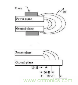 是指電源層相對地層內縮20H的距離,當然也是為抑制邊緣輻射效應。在板的邊緣會向外輻射電磁干擾。將電源層內縮,使得電場只在接地層的范圍內傳導。有效的提高了EMC。若內縮20H則可以將70%的電場限制在接地邊沿內;內縮100H則可以將98%的電場限制在內。