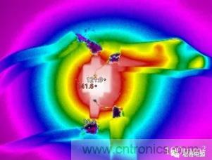 將10cmX10cm的二層PCB板的覆銅改為1OZ,重復(fù)上面實(shí)驗(yàn),測(cè)量的溫度如下圖所示。