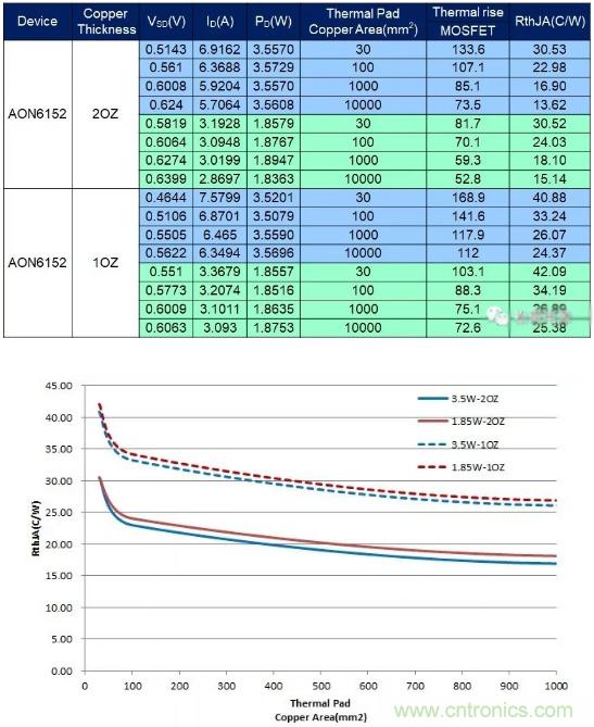 下面分別以一塊10cmX10cm、2OZ覆銅的二層PCB板來做試驗(yàn),板厚1.5mm,PCB底層覆銅沒有通過過孔連接到頂層,將封裝為DFN5*6器件AON6152焊接在PCB板,同時(shí)AON6152的D極下面分別鋪設(shè)四種不同尺寸的銅皮:30mm2、100mm2、1000mm2、10000mm2。然后給四塊板的AON6152灌入相同的功率,測(cè)量AON6152的溫升,計(jì)算相應(yīng)的熱阻RJA。將AON6152灌入功率減小一半,重復(fù)上面的實(shí)驗(yàn),測(cè)量其溫升,再次計(jì)算相應(yīng)的熱阻RJA。