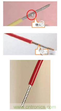 浸錫就是將金屬表面沾上一層錫,防止氧化,方便焊接。時(shí)至今日,浸錫在連接器行業(yè)中仍是廣泛應(yīng)用,浸錫的好壞直接影響到產(chǎn)品的性能及使用壽命。我們都知道導(dǎo)體的電阻在電流的作用下會(huì)發(fā)熱,電流越大發(fā)熱量也就越高,浸錫工藝可以將一根一根細(xì)導(dǎo)線間的空氣用錫填滿從而減少發(fā)熱量。同時(shí)由于多股導(dǎo)線容易散,直接壓在接線端子上時(shí),接觸面積會(huì)減少,所以很多廠家選擇浸錫的方式,以免接觸不良發(fā)熱燒壞。浸錫標(biāo)準(zhǔn)比較嚴(yán)格,需均勻,平滑,厚度0.05~0.1mm,不能有錫尖,凸錫球,漏錫,堆疊,變形等情況發(fā)生,否則反而會(huì)加大接觸電阻,增加發(fā)熱量。