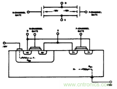 圖1是一個(gè)典型CMOS輸出開關(guān)單元的電路圖及截面圖。從不同單元和區(qū)域之間的連接關(guān)系中,我們可以畫出一個(gè)等效二極管電路圖(圖2)。如果在S端或D端的模擬輸人電壓超過電源電壓。
