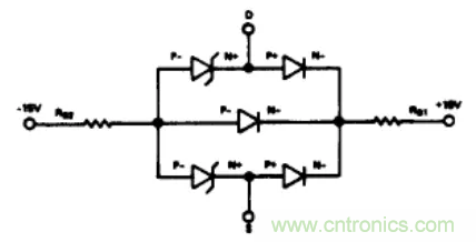 圖4舉例說明了通過在電源供電引腳串聯(lián)二極管(比如1N459)防止寄生晶體管導(dǎo)通的方法。如果S端或D端電壓高于電源電壓時(shí),CR1和/或CR2反向偏置,基極驅(qū)動(dòng)電路不能使晶體管導(dǎo)通。每個(gè)CMOS器件都應(yīng)該有一對(duì)獨(dú)立的二極管對(duì)其進(jìn)行保護(hù)。盡管這個(gè)方法很有效,但它不是萬無一失的。如果開關(guān)的一端連接到一個(gè)負(fù)電位(例如一個(gè)充電電容),并且另一端電壓超過VDD,則盡管有保護(hù)二極管。