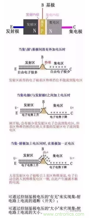 【導(dǎo)讀】這里講解三極管的發(fā)明史、核心結(jié)構(gòu)、結(jié)構(gòu)示意圖、制造流程、結(jié)構(gòu)切面圖、工藝結(jié)構(gòu)特點、電路符號、電流控制原理示意圖、基本電路等,讓大家全面了解三極管。