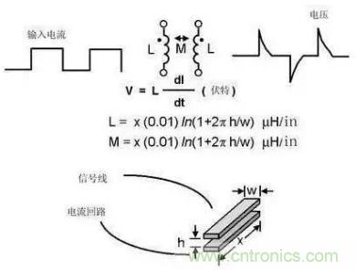 流經電路板走線的開關電流將引起電壓發生變化,電路板走線存在寄生電感,可采用如下公式計算電壓的變化:V = LdI/dt。其中:V = 電壓的變化,L = 電路板走線感抗,dI = 流經走線的電流變化,dt =電流變化的時間。