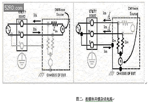 “傳導式EMI”可以分成兩類:差模(Differential mode;DM)和共模(Common mode;CM)。差模也稱作“對稱模式(symmetric mode)”或“正常模式(normal mode)”;而共模也稱作“不對稱模式(asymmetric mode)”或“接地泄漏模式(ground leakage mode)”。