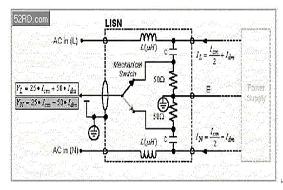 假設在此LISN電路中,L和C的值是這樣決定的:電感L小到不會降低交流的電源電流(50/60Hz);但在期望的頻率范圍內(150 kHz to 30 MHz),它大到可以被視為“開路(open)”。電容C小到可以阻隔交流的電源電壓;但在期望的頻率范圍內,它大到變成“短路(short)”。上面的敘述(幾乎)是為真的。在圖三中,主要的簡化部分是,纜線或接收機的輸入阻抗已經被包含進去了。將一條典型的同軸纜線連接到一臺測量儀器(分析儀或接收機或示波器…等)時,對一個高頻訊號而言,此纜線的輸入阻抗是50歐姆(因為傳輸線效應)。所以,當接收機正在測量這個訊號時,假設在L和E之間,LISN使用一個“繼電/切換(relay/switch)電路”,將實際的50歐姆電阻移往相反的配對線路上,也就是在N和E之間。如此就能使所有的線路在任何時候都能保持均衡,不管是測量VL或VN。