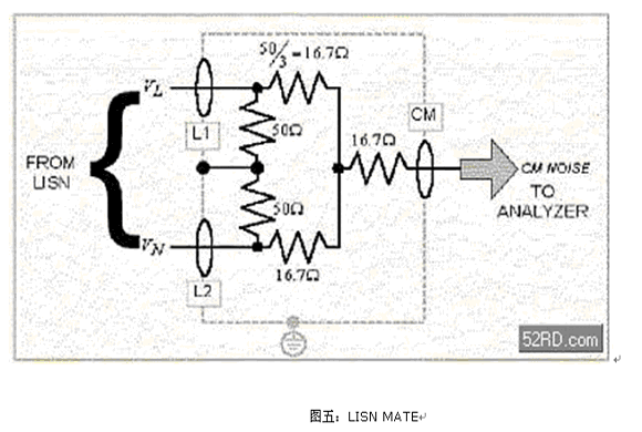 有一種裝置稱作“LISN MATE”,不過,目前已經很少被使用了。它會衰減DM雜訊約50dB,但不會大幅衰減CM雜訊(約僅衰減4dB)。它的電路如圖五所示。