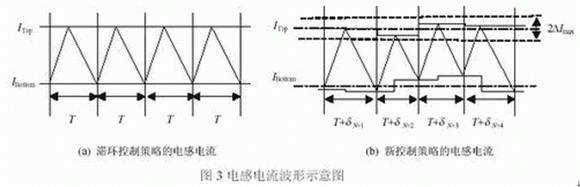 [page] 如圖2所示為一種常見(jiàn)的DC/DC控制策略——滯環(huán)控制策略。該控制策略限定了電感電流波動(dòng)的最大值ITop和最小值Ibotton,電感電流波形如圖3a所示。此時(shí),電感電流為周期的,變換器有固定的開(kāi)關(guān)周期T。設(shè)電感電流為ILp(t),則