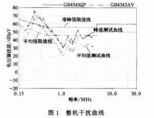 圖1是某一臺空調(diào)產(chǎn)品連續(xù)干擾電壓的測試曲線(執(zhí)行GtM343.1—2003《家用和類似用途電動、電熱器具,電動工具以及類似電器無線電干擾特性測量方法和允許值》l11)。表1是超出限值的一些頻率點及連續(xù)干擾電壓的峰值和平均值的測量值。