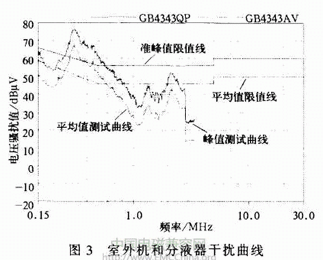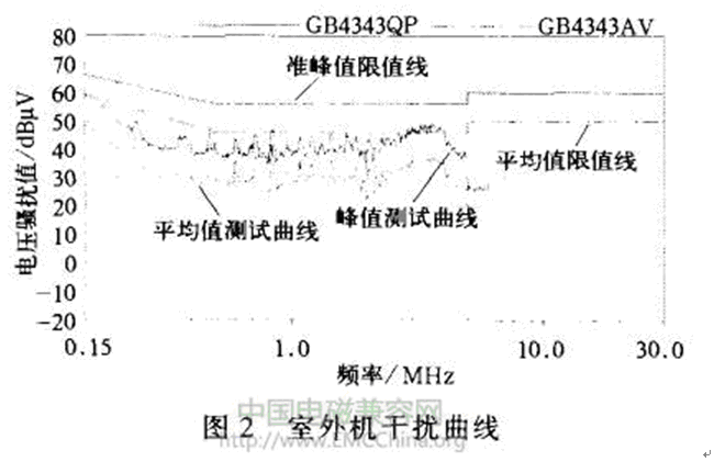 從圖2可以看出,測量的連續(xù)干擾電壓的峰值曲線和平均值曲線均沒有超過限值線,且有一定的裕量,由此可以排除室外機控制器和壓縮機干擾的可能。
