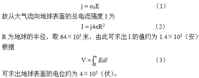 很多人都不清楚,地球也是一個帶電體。根據實驗測試,在地球表面存在一個垂直向下的穩定電場,電場強度E約為100伏/米,場強的大小隨高度的增加而減弱。另外,根據實驗測試,在地面附近大氣的電導率σ0約為3×10-14西蒙/米,且隨高度的增加而增加。由此可知地球表面的電流密度j的方向指向地心,大小為: