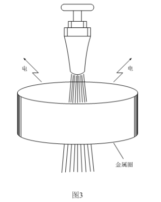 圖3是一個(gè)讓物體產(chǎn)生高壓電的原理圖,在水龍頭的下面安放一個(gè)用金屬薄片制作的圓圈(用金屬罐頭盒改制),金屬圓圈必須要與周圍絕緣,然后讓水龍頭流出的水正好從金屬圓圈的中央穿過,金屬圓圈很快就會(huì)帶電,并且電壓非常高,一般可達(dá)一萬伏以上。用試電筆做試驗(yàn)時(shí),當(dāng)試電筆離金屬圓圈還很遠(yuǎn)的地方,就可以看到試電筆被點(diǎn)亮,甚至拿一個(gè)小熒光燈靠近,也可以看得到熒光燈微亮。這說明電壓非常高,但對(duì)人體不存在被觸電的危險(xiǎn),因?yàn)榻饘賵A圈的電容量很小,存儲(chǔ)的能量有限。